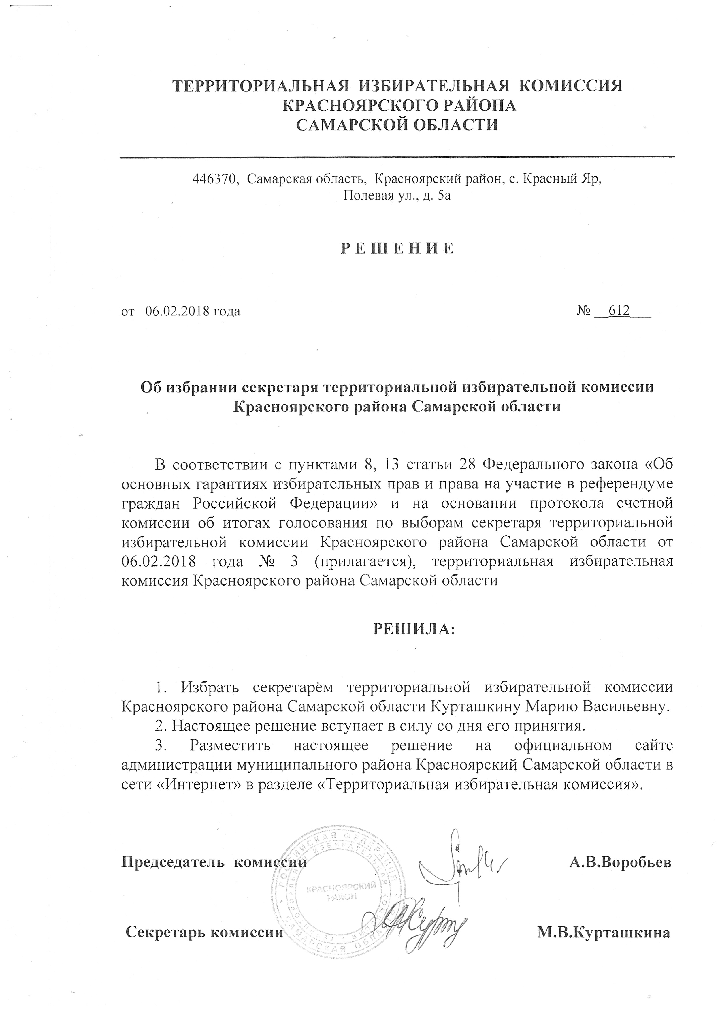 Решение №612 от 06.02.2018 Об избрании секретаря территориальной избирательной комиссии Красноярского района Самарской области