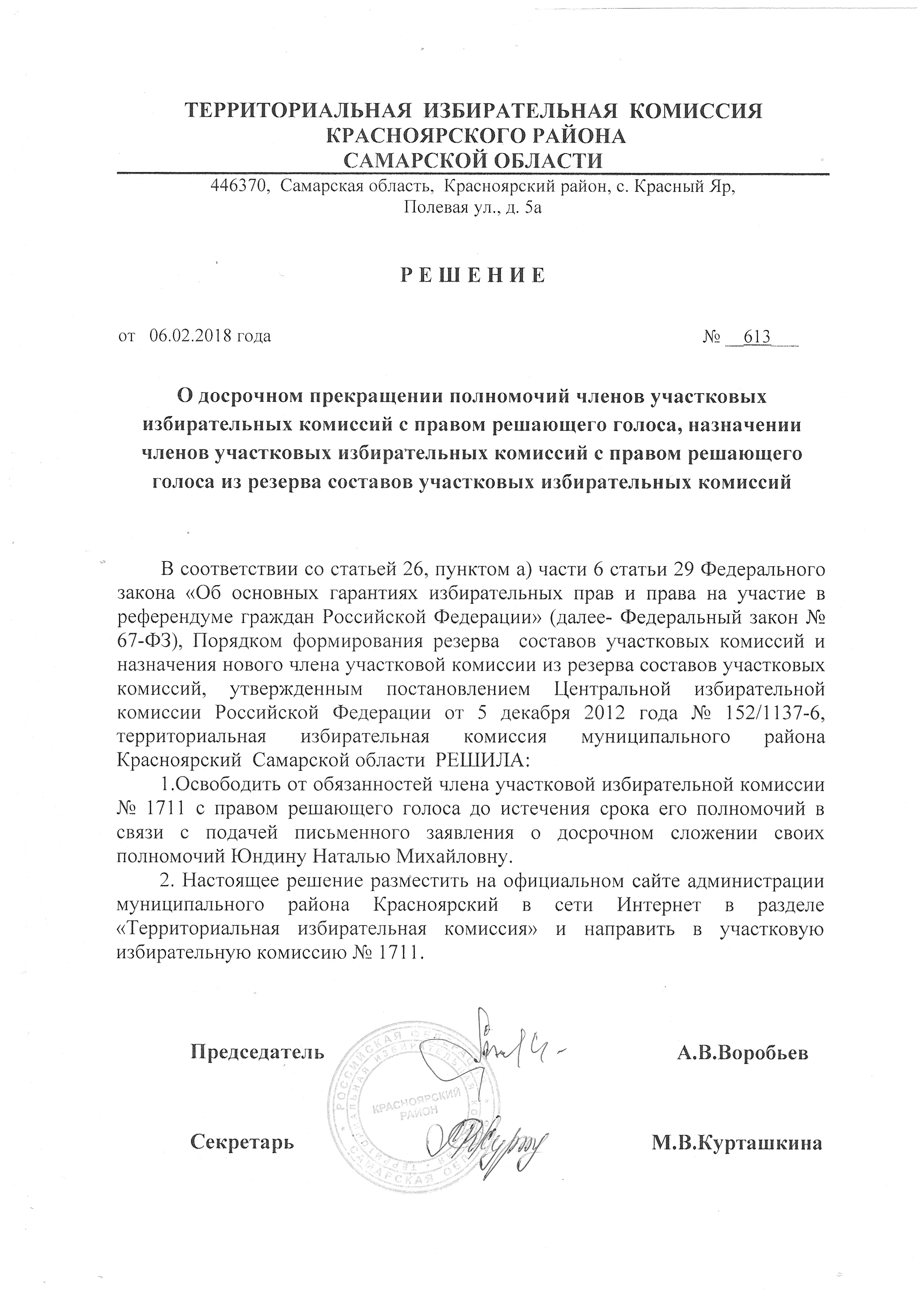 Решение №613 от 06.02.2018 О досрочном прекращении полномочий членов участковых избирательных комиссия с правом решающего голоса, назначении членов участковых избирательных комиссий с правом решающего голоса из резерва составов участковых избирательн